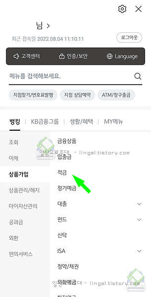 우측 상단의 "전체메뉴"을 누르고 "상품가입", "적금"을 차례대로 눌러줍니다.