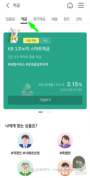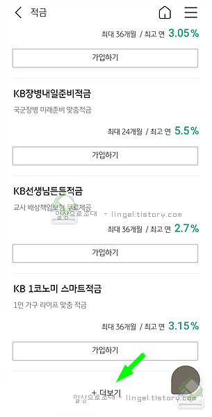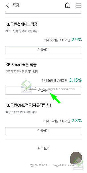 맨 아래로 내려서 "+더보기"를 누르고 조금 내리다 보면 "KB SMart ★ 폰 적금" 상품이 나옵니다.