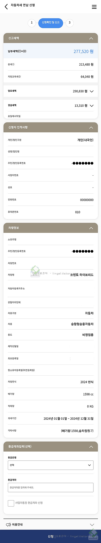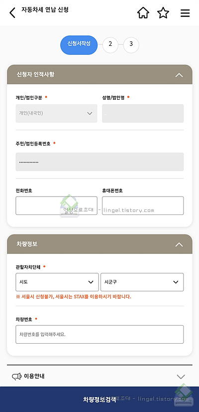 인적사항과 지역, 차량번호 입력후 나머지 절차를 진행하면 됩니다.