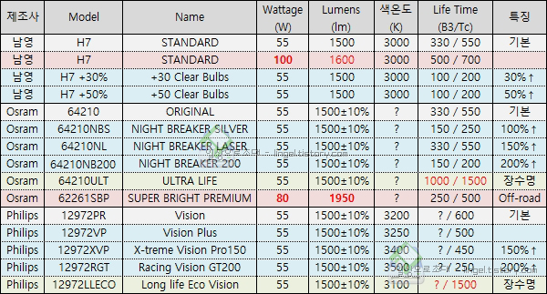 하지만 Philips 제품을 보면 색온도(K)가 다르다는것을 알 수 있습니다. (Osram 제품은 색온도 정보가 없습니다.)