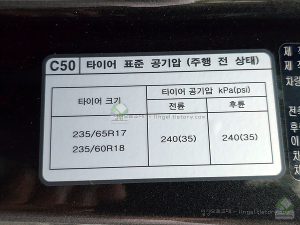 대부분의 차종에는 이곳에 표준공기압이 스티커로 붙어있습니다.