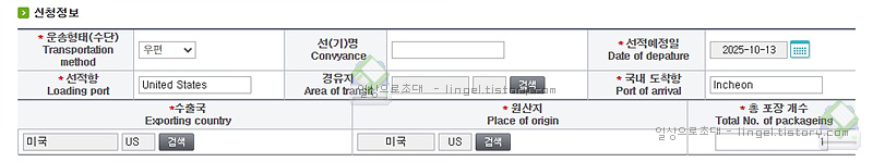운송형태(수단) : 우편 해외여행중 직접 가져오는 경우는 "휴대"가 되겠지요.