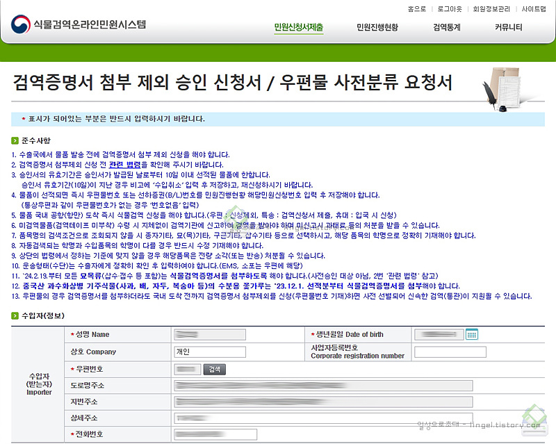 "민원신청서제출 - 검역증명서 첨부 제외 승인 신청서/우편물 사전분류 요청서" 를 누릅니다.
