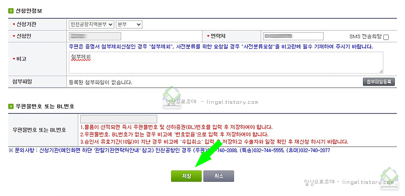 신청인 정보 적어주고 "저장"을 누릅니다.