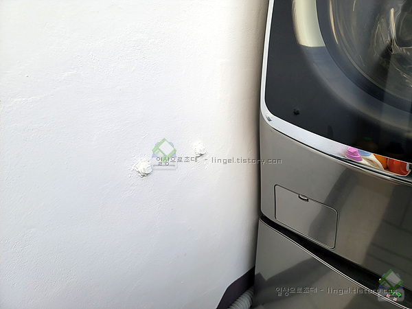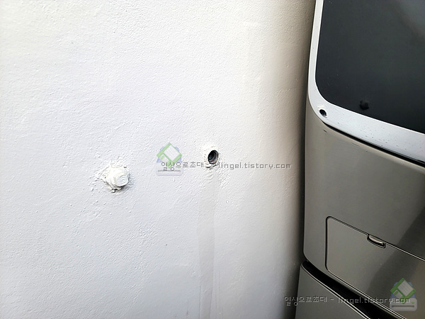 발코니의 세탁기 앞부분에 배관이 있는데