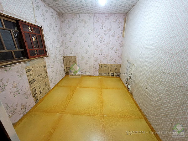 신문지를 벽지처럼 발라 놓은 방