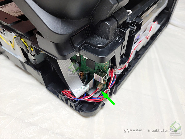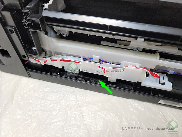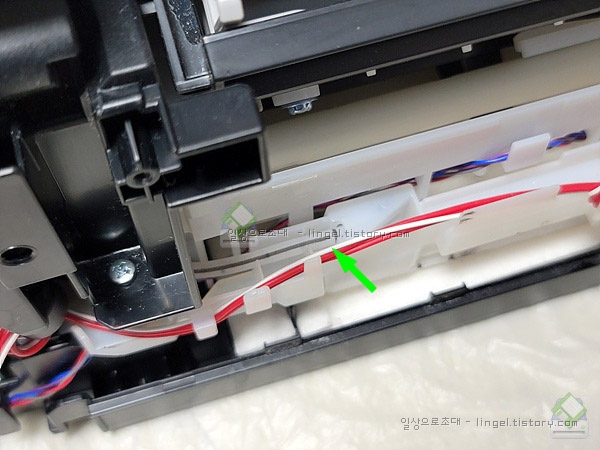 폐잉크가 버려지는 실리콘 호스입니다. 원래의 위치에 잘 끼워넣고 부품을 조립합니다.