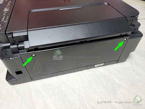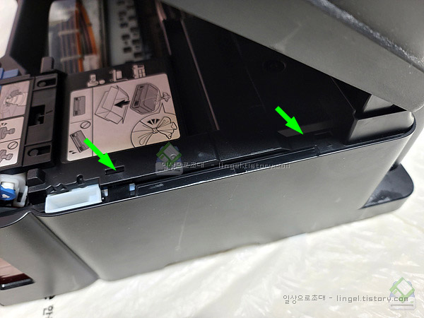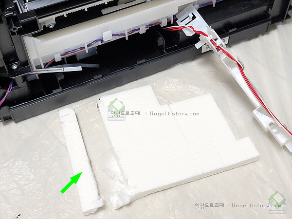 벗겨진 뒷커버 아래로 업소버(스폰지, 폐잉크통) 확인이 됩니다.