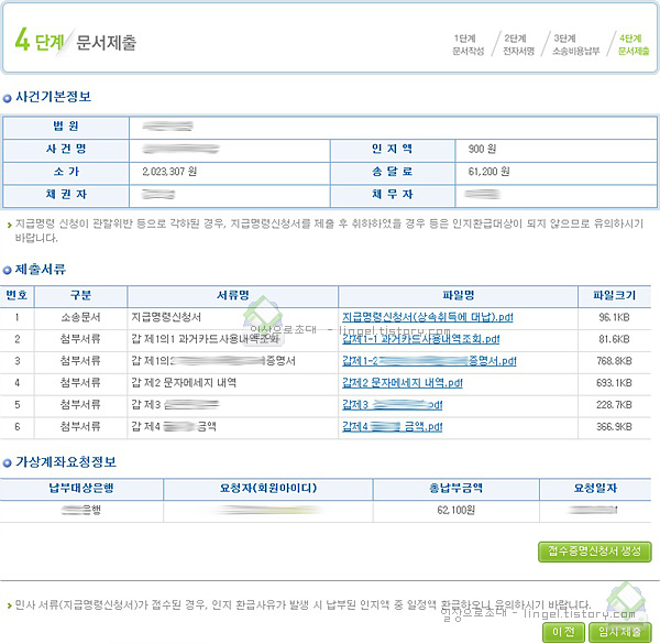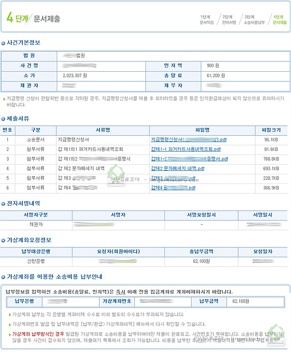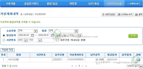 나의 소송 - 가상계좌내역 에서 납부 확인이 가능합니다.