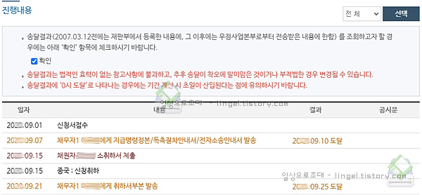 상대방에게 송달이 되었는지, 아닌지 등의 진행내용을 확인 가능합니다.