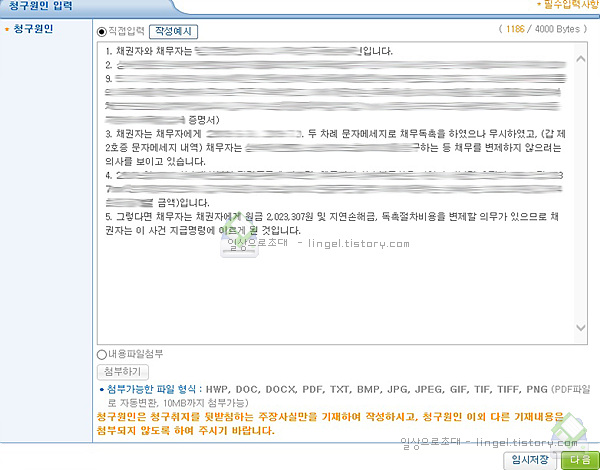 청구원인 파일 첨부보다는 미리 작성했다가 복사 붙여넣기 하는것이 좋습니다.