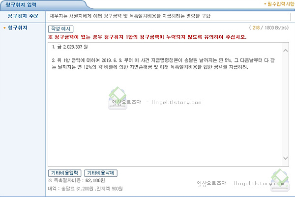 소가와 청구금액은 내가 받아야 할 금액을 입력하면 되고, (일반적인 소액청구의 경우 동일함)