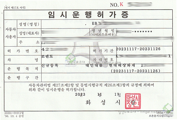 신차를 인수하게 되면 임시운행허가증이 차량과 함께 따라옵니다.