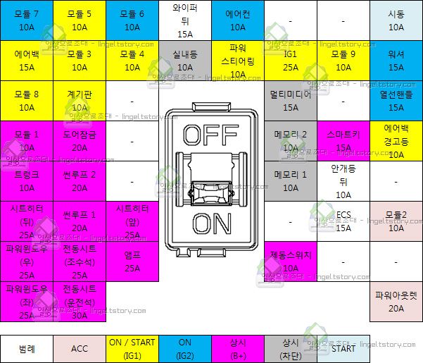 K5(JF)의 퓨즈박스입니다. 전원의 종류별로 퓨즈의 색깔을 구분해놨으니