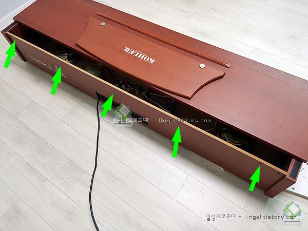 건반덮개를 분해할때는 위 홈이 있는 부분에 둥근 기어가 위치하도록 반쯤 닫은 뒤 들어서 빼주면됩니다.